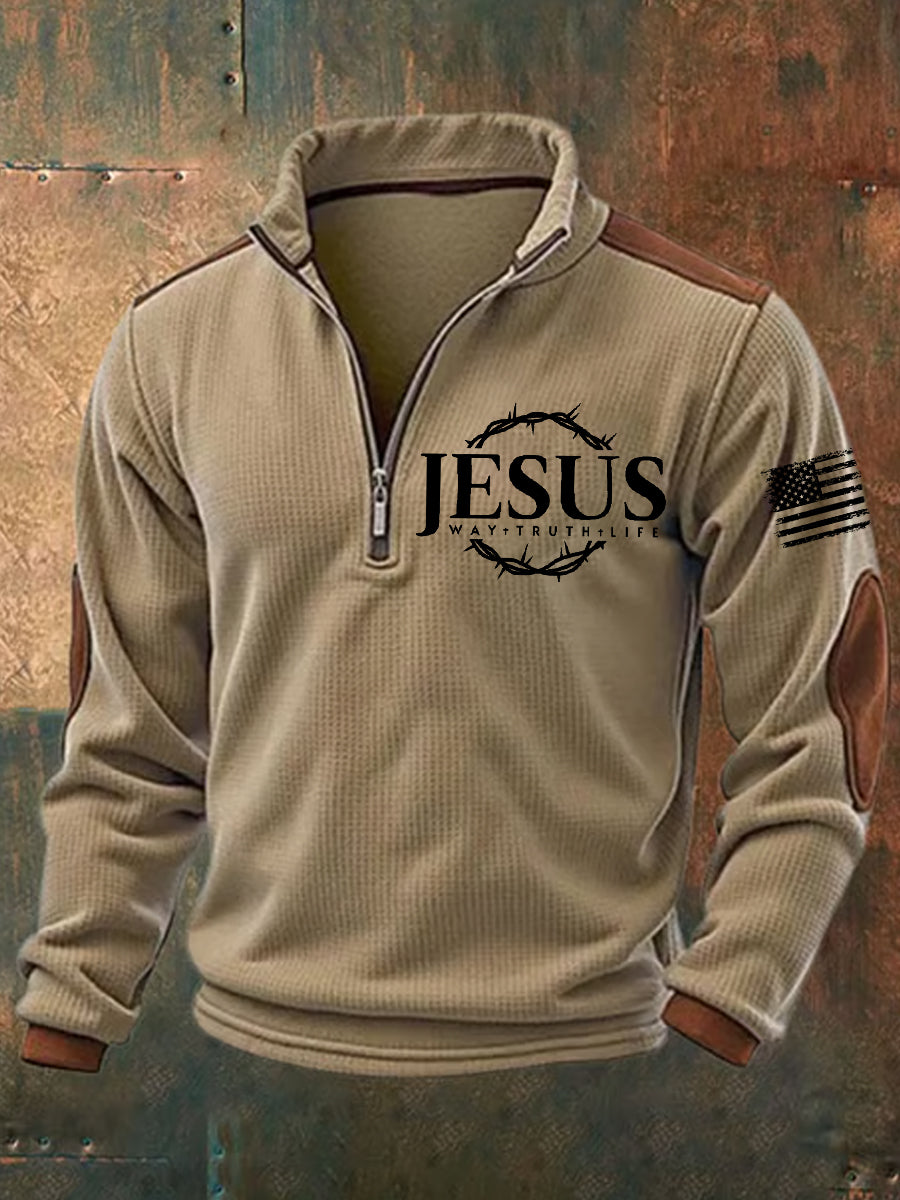 Men's Faith Cross Print Zipper Stand Collar Sweatshirt