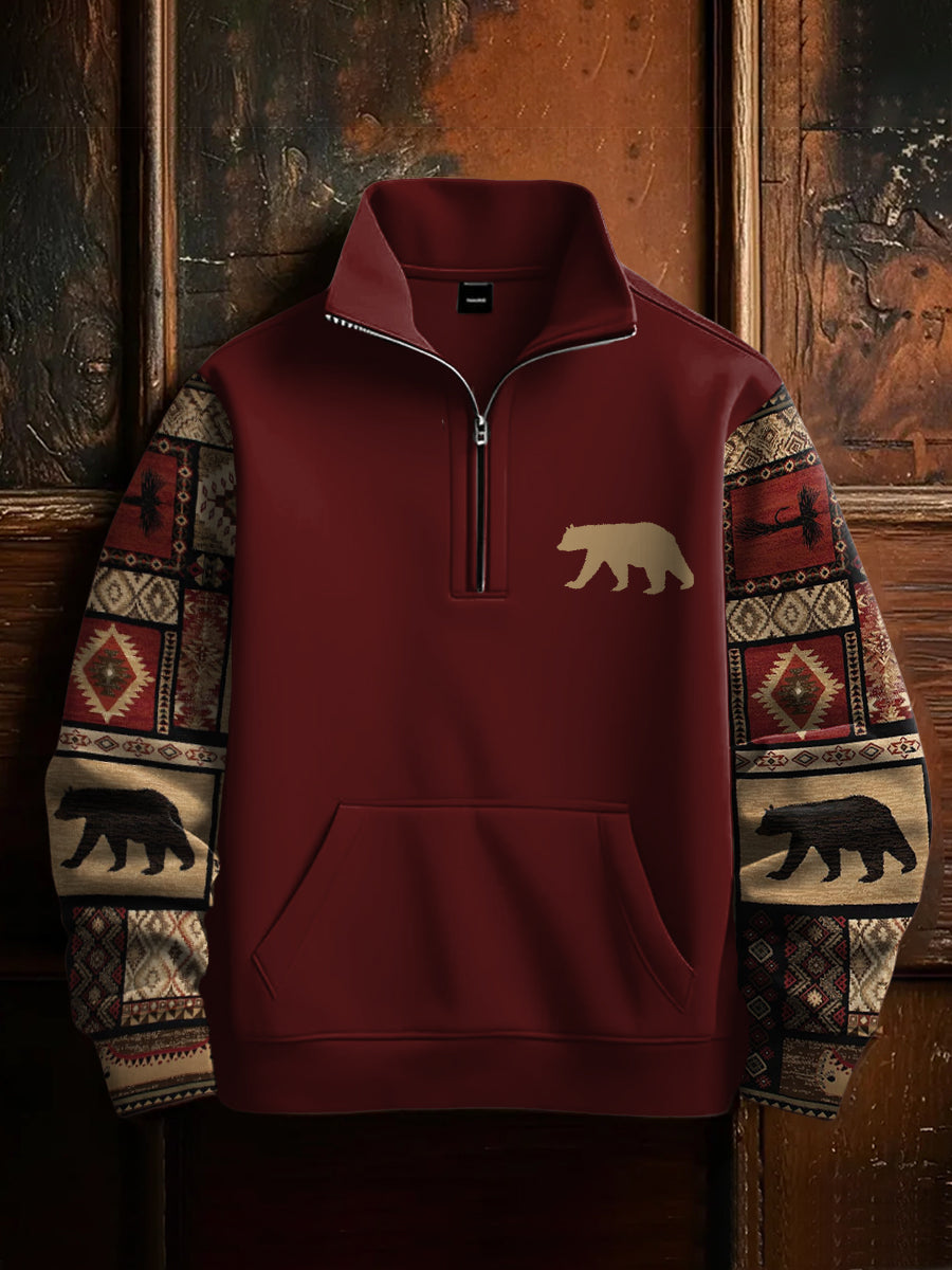 Men's Retro Western Aztec Bear Print Casual Zipper Sweatshirt
