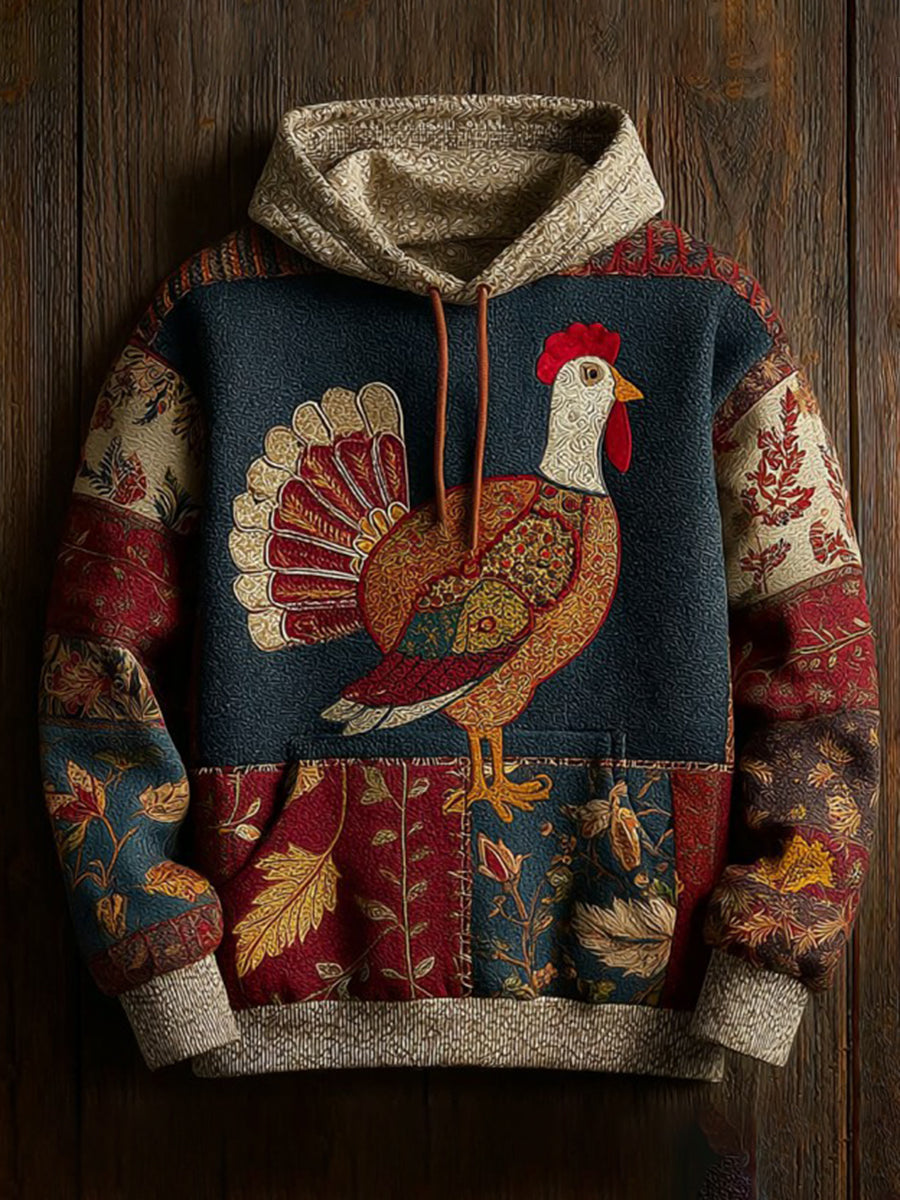 Vintage Thanksgiving Turkey Patchwork Print Art Casual Hoodie