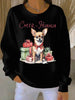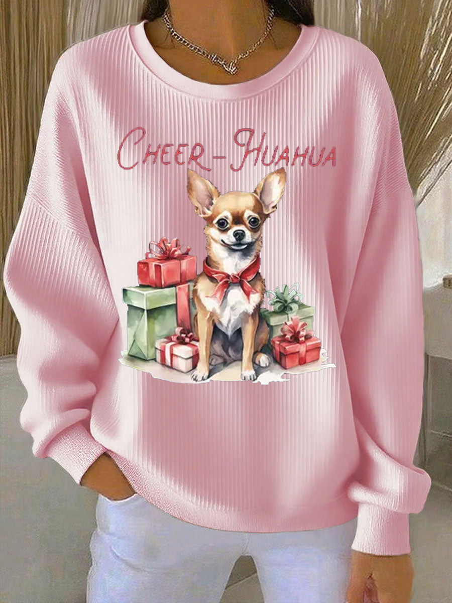 Women's Cheer Huahua Christmas Chihuahua Ribbed Round-Neck Sweatshirt