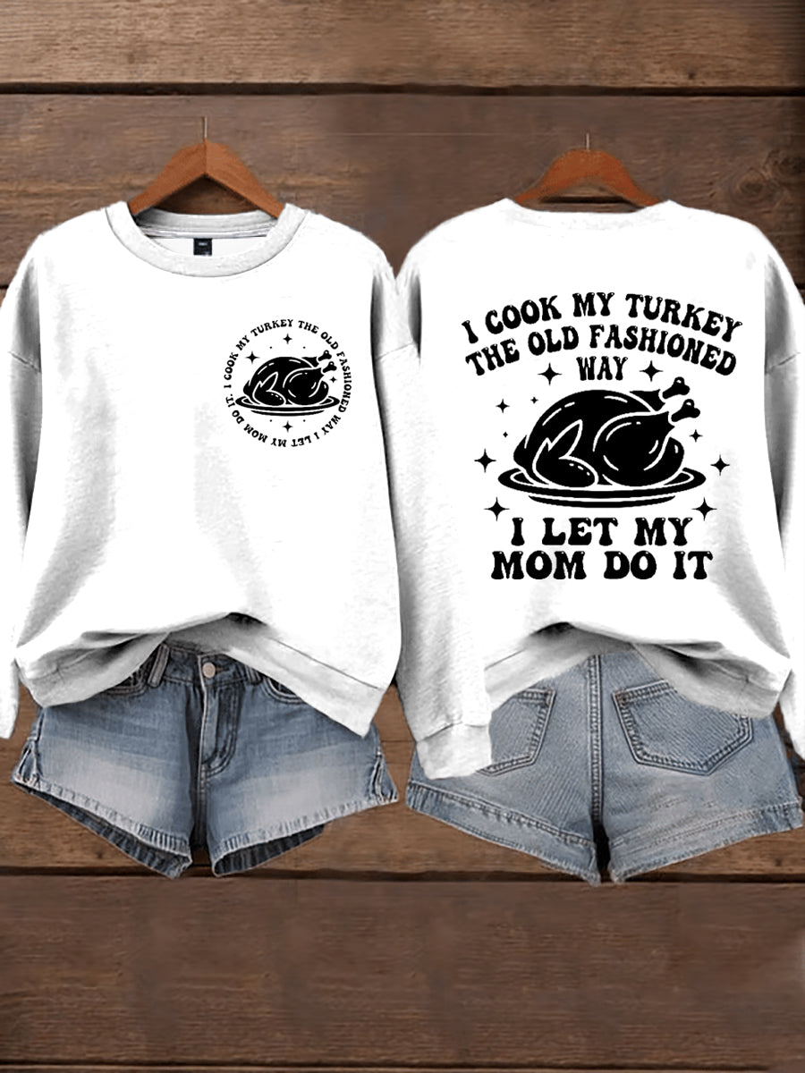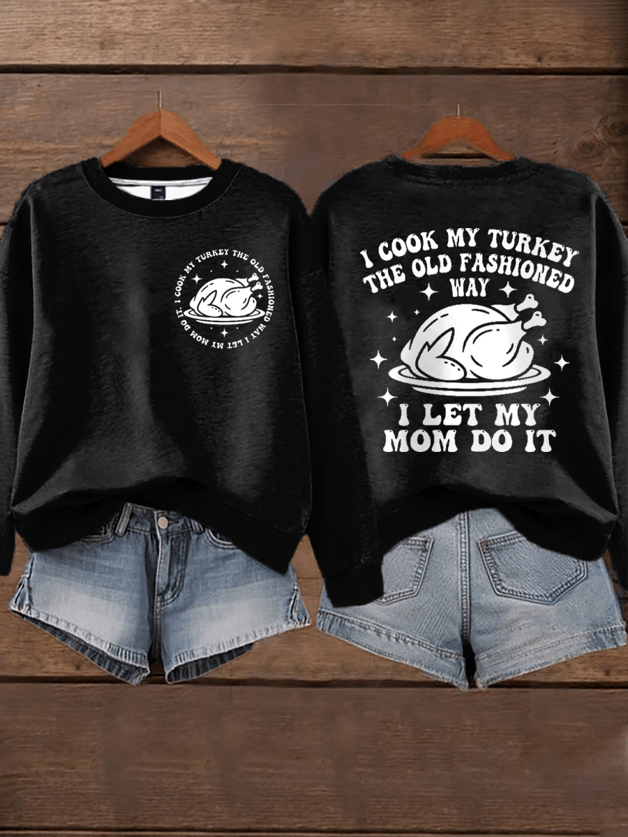 Women's I Cook My Turkey The Old Fashioned Way I Let My Mom Do It Funny Thanksgiving Sweatshirt