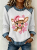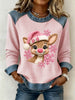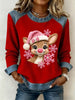 Women's Pink Christmas Reindeer Art Printed Denim Patchwork Waffle Top