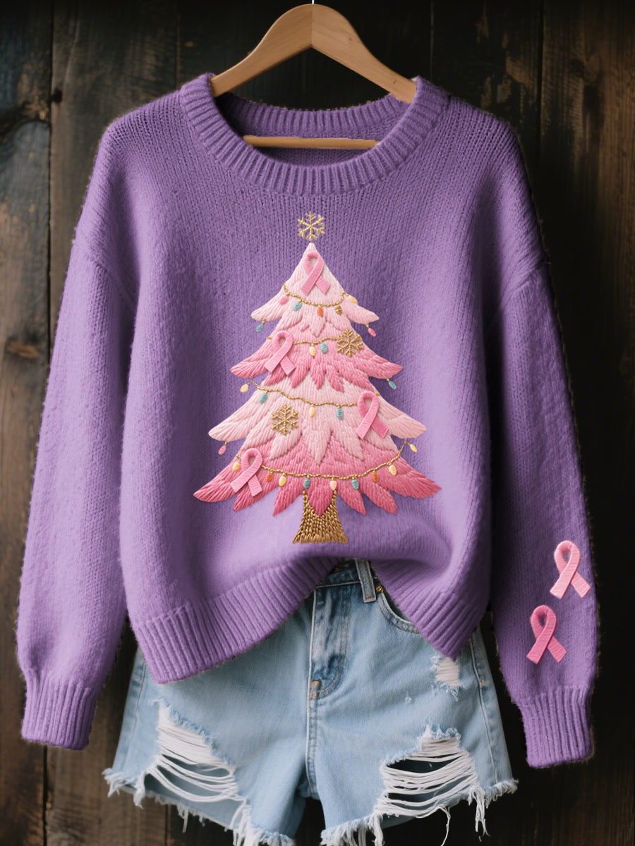 Women's Pink Christmas Tree Embroidered Cozy Knit Sweater